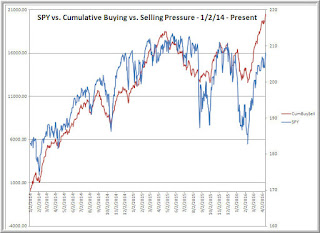 * Buying interest continues to swamp selling pressure on the upticks/downticks measure. The cumulative ticks have broken to a new high (see chart below) and institutional participation (total upticking and downticking) has been strong. That has led to positive near-term returns on a short-term basis.